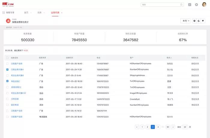 3、线索转化:根据可配置的线索转化条件,线索无损的转化为客户、联系人、销售机会,转化过程清晰规范;