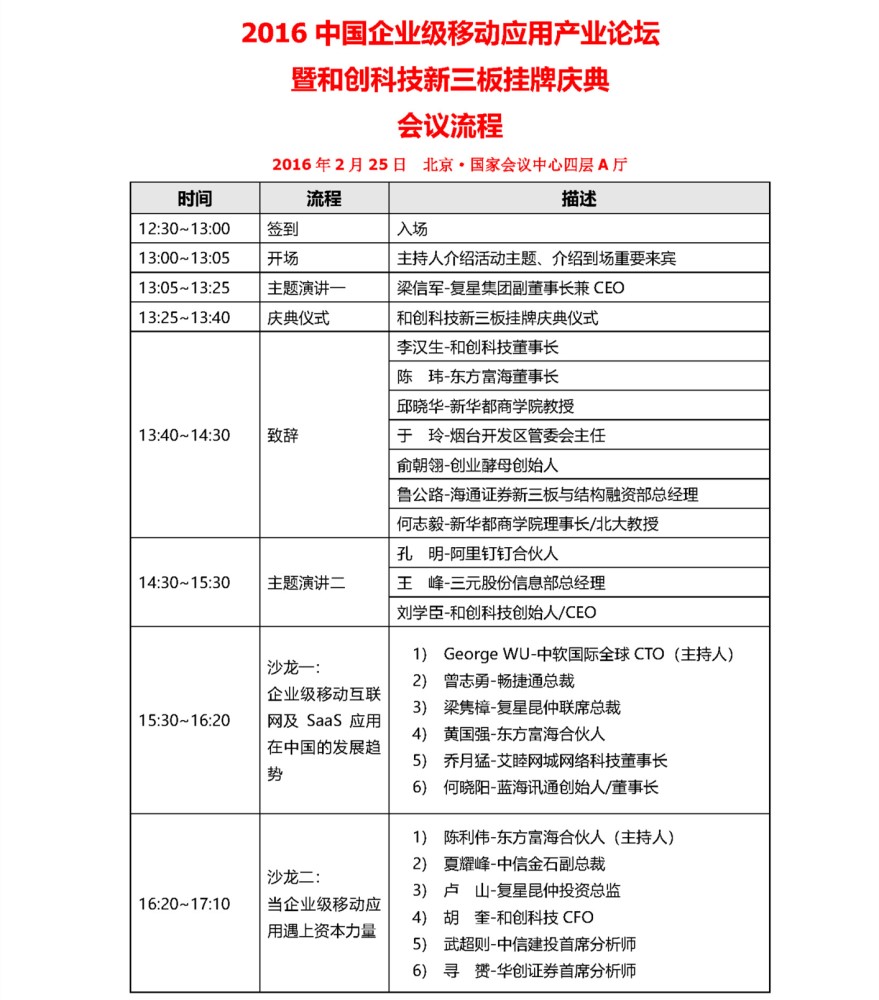 和创科技(证券代码834218)作为中国企业级移动互联网SaaS应用第一股,是在和创科技各位股东、客户、合作伙伴及团队的长期支持和卓越努力下,服务了国内近十万家企业。作为产业级SaaS移动应用的领军企业,和创科技将联合复星昆仲、东方富海、新华都商学院于2016年2月25日下午在北京国家会议中心共同举办“2016中国企业级移动应用产业论坛暨和创科技新三板挂牌庆典”,这即是答谢各位股东朋友们的长期支持,也是剖析产业级SaaS行业在产品研发、市场营销、运维续费和资本进入等方面的行业主题。