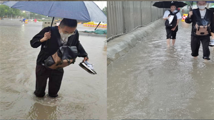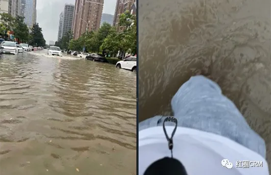 16点,红圈运营团队的几名同事刚刚结束对一家客户拜访,正在前往另一家客户的路上,此时雨水已经淹没膝盖。