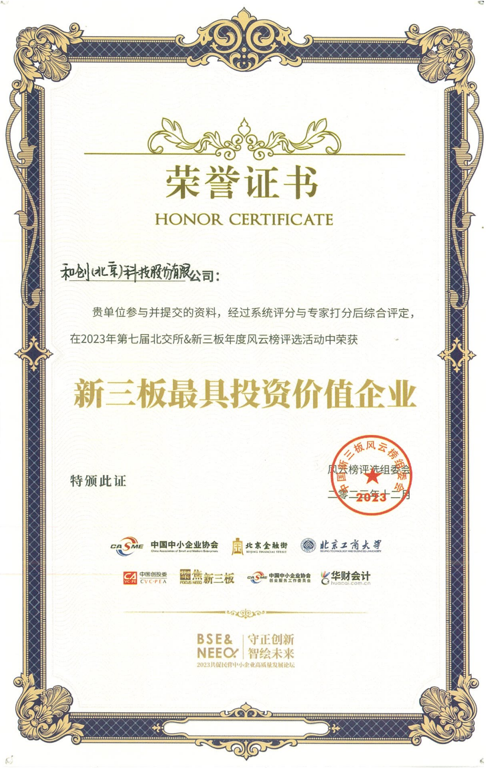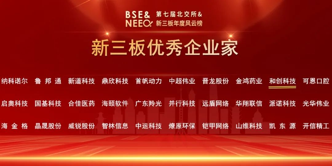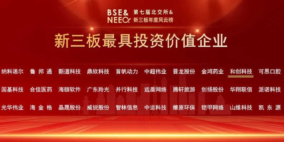 经由北交所及新三板投资者保护指数综合评选,和创科技荣获第七届北交所&新三板年度风云榜盛典“新三板最具投资价值企业”,和创科技创始人/总经理刘学臣被评为“新三板优秀企业家”。