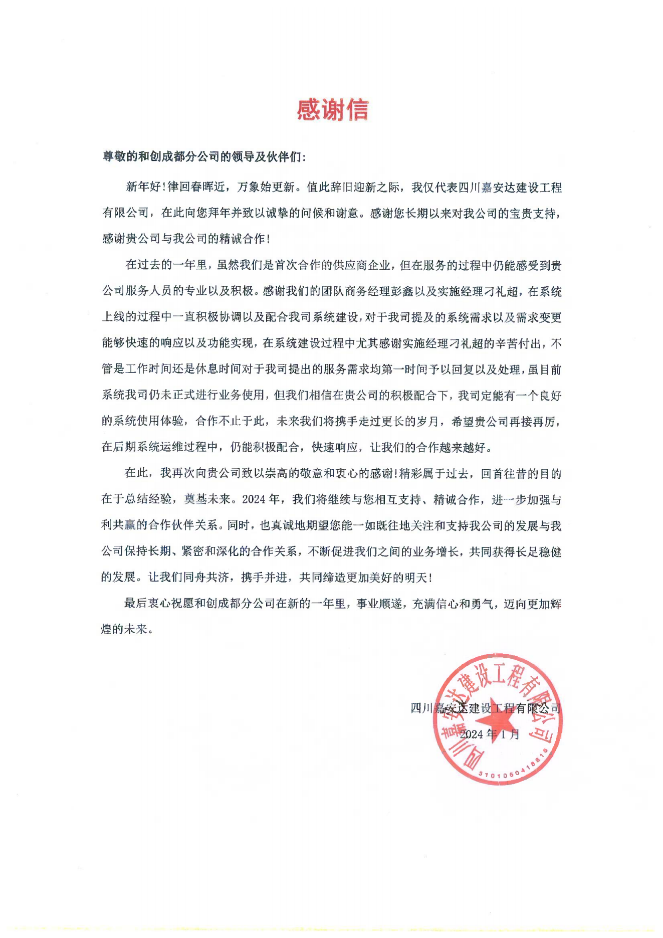 四川嘉安达建设工程有限公司向红圈发来感谢信!客户的认可是我们最大的动力!