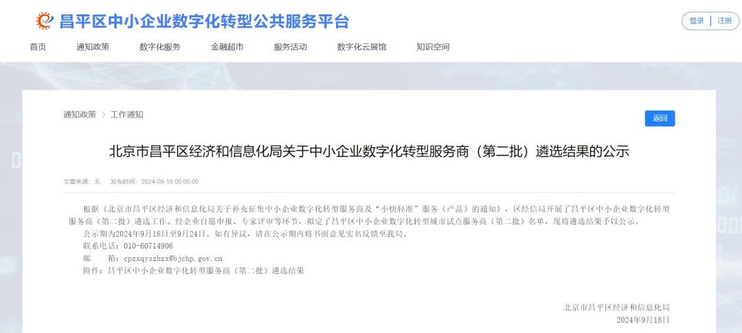 继2024年7月入选“济南市工业和信息化局正式公布了济南市第二批中小企业数字化转型试点城市服务商名单”之后,此次在北京市昌平区入选也标志着和创科技在数字化转型领域的实力和成就再度得到了官方的高度认可。