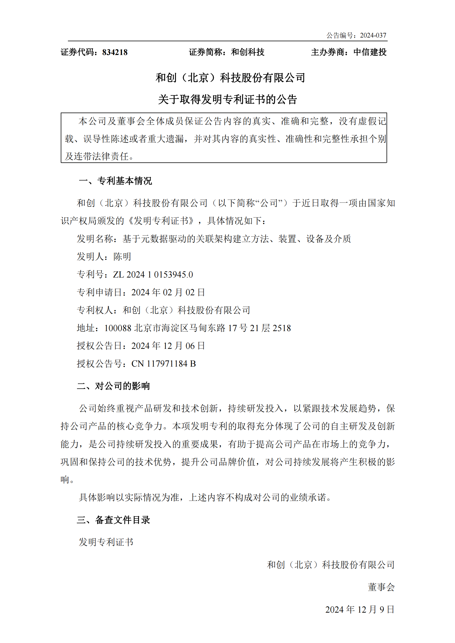 新专利的获得是公司持续加大研发投入、注重技术创新结出的硕果。未来,和创科技将继续秉承创新驱动发展的理念,不断推出更多具有自主知识产权的核心技术,为客户创造更大价值,为社会进步贡献更多力量。