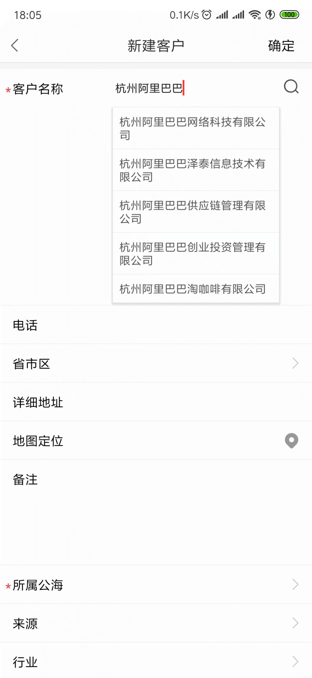 如输入关键字“杭州阿里巴巴”后,系统将在下拉选项框中显示抓取到的所有包含“杭州阿里巴巴”关键字的企业名称,选择相应的企业名称后,该企业的地址、注册资本、法人等工商信息将全部呈现出来,销售人员只需点击“回填”,该企业的工商信息就能自动填充到系统中。此项功能将大大提高销售线索/客户信息创建的效率,并保证数据的准确性,很好地解决销售撞单、抢单等问题。