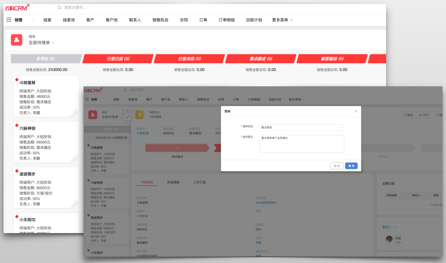 新版本在销售机会阶段推进的过程中加⼊了“理单”环节,提供了一个销售管理者与⼀线销售⼈员⼀对⼀评价指导的平台,管理层可以为销售⼈员提供针对性的⼯作指导,提高销售成功率,并能更加客观和准确地做出销售预测。对于理单条件和理单阶段等的自定义设置,企业同样可以在后台实现。