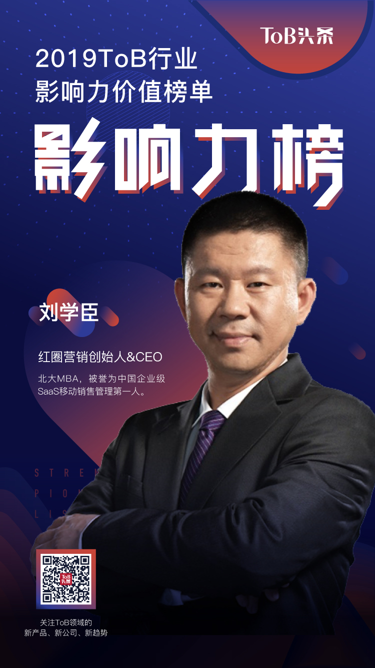 近日,由“ToB行业头条”主办的【ToB行业2019影响力价值榜单——人物榜】重磅发布,红圈营销创始人兼CEO刘学臣荣登“ToB行业影响力人物榜”。
