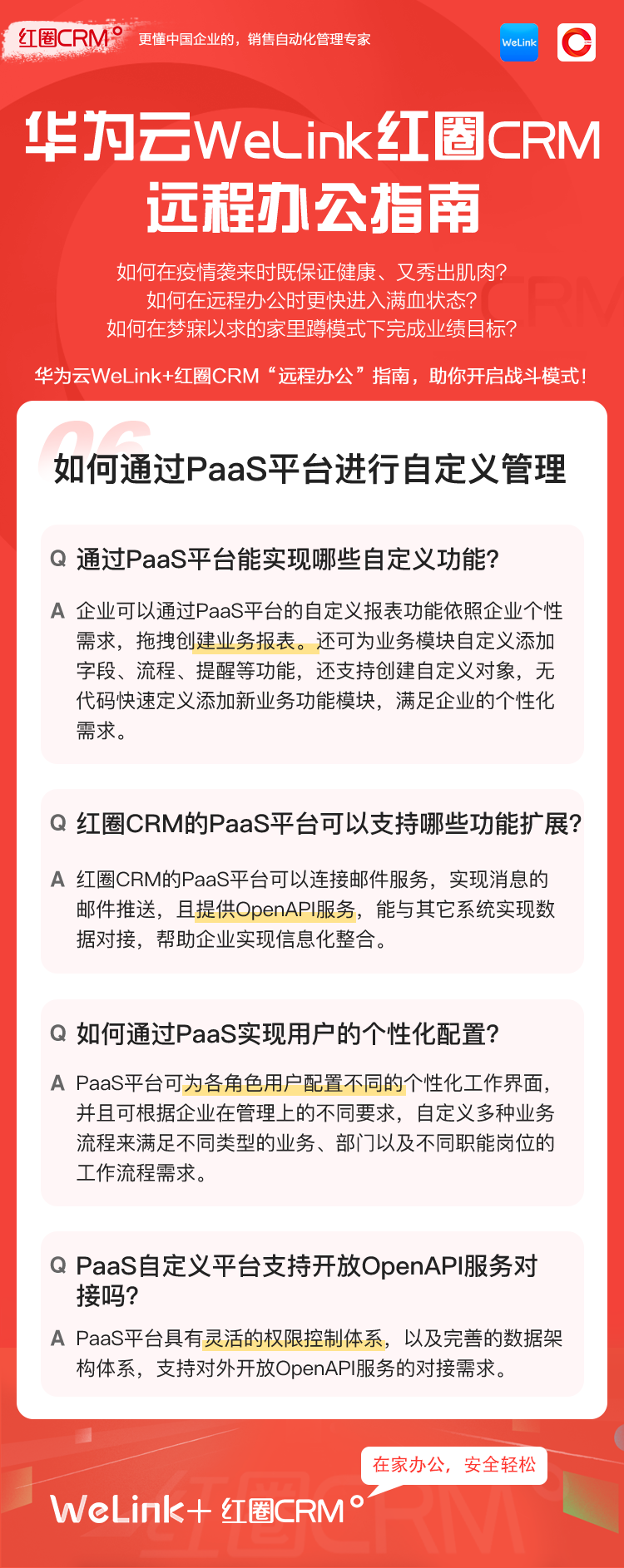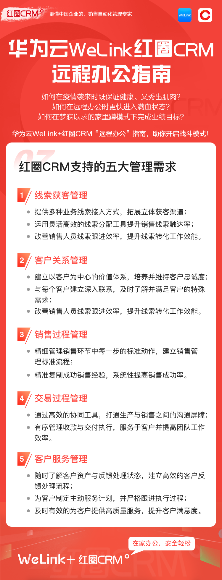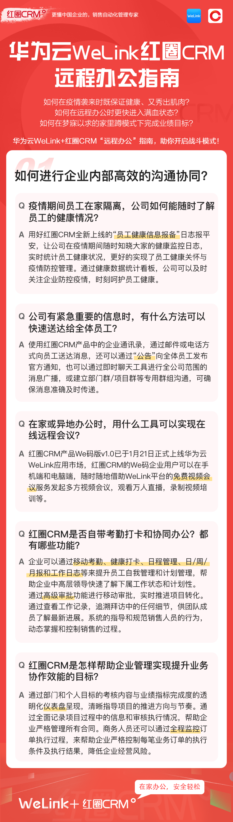 如何让在家办公安全、轻松、高效?华为云WeLink携手红圈CRM提供了安全、智能、开放的移动办公解决方案,并提供免费的在线视频会议服务,请您收好这份远程移动办公宝典!