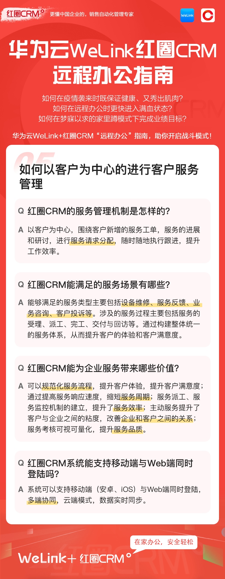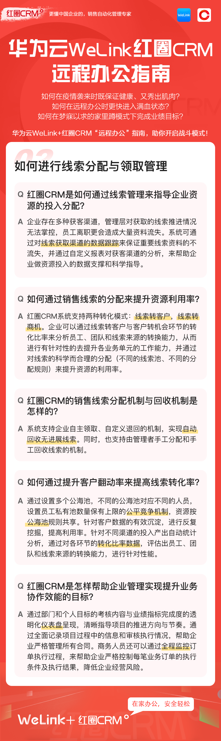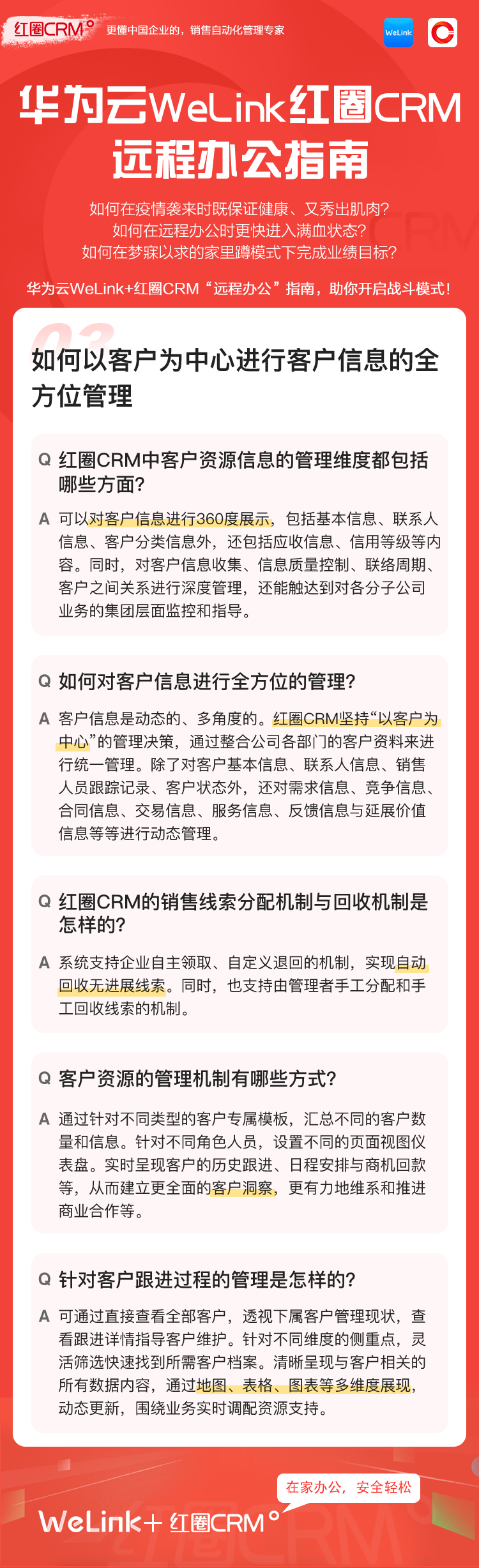 如何让在家办公安全、轻松、高效?华为云WeLink携手红圈CRM提供了安全、智能、开放的移动办公解决方案,并提供免费的在线视频会议服务,请您收好这份远程移动办公宝典!