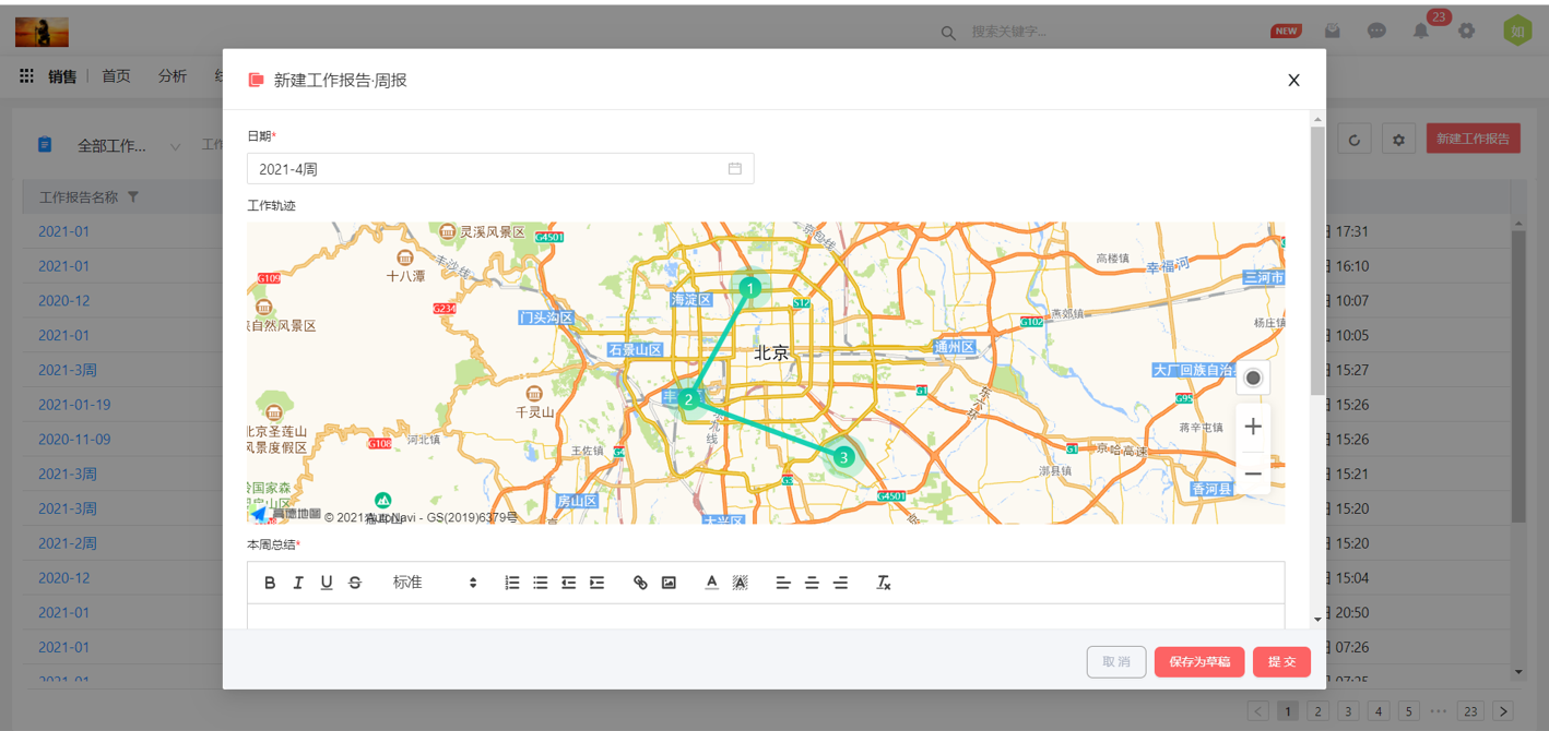 工作报告支持定位,可以生成轨迹报告了,同时工作计划总结支持结构化形式填写,相信你的工作报告以后会更专业出彩。