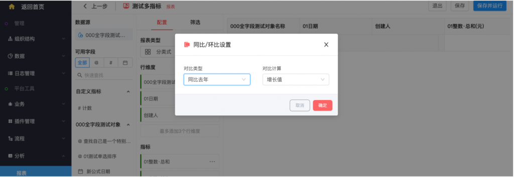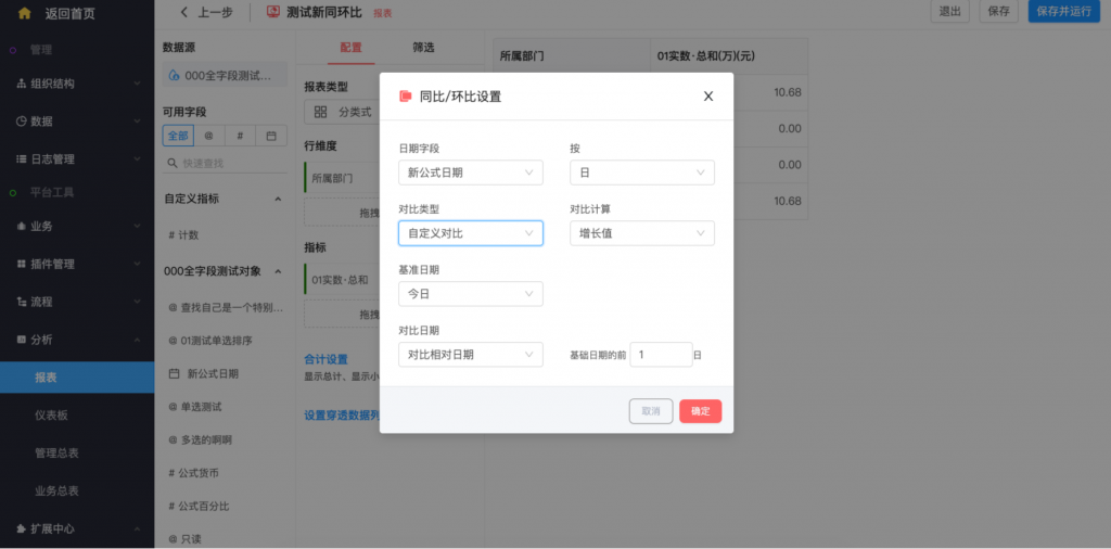 - 无时间维度的同环比设置,增加了自定义对比计算(相对日期和固定日期)