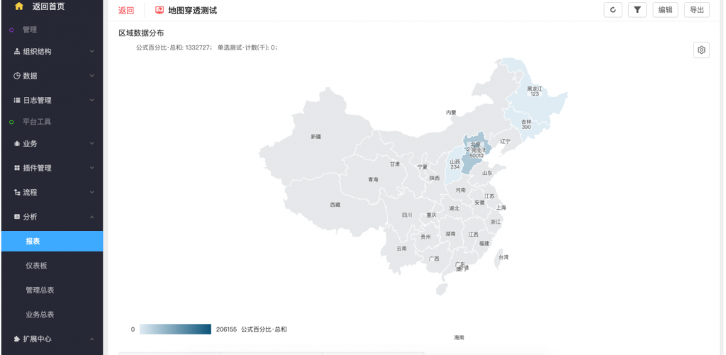- 地图可设置默认显示区域,区域可进行向下钻取,如点击北京市,可查看北京各区的数据。每个区域的颜色代表数值的大小,颜色越深数值越大