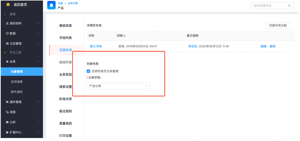 - 列表分类管理,通过指定一个单选字段作为分类,实现了对象列表页左树右表的效果;在查看、选择对象时可以根据分类快速进行查询。(一个比表头筛选更快捷的筛选方式)