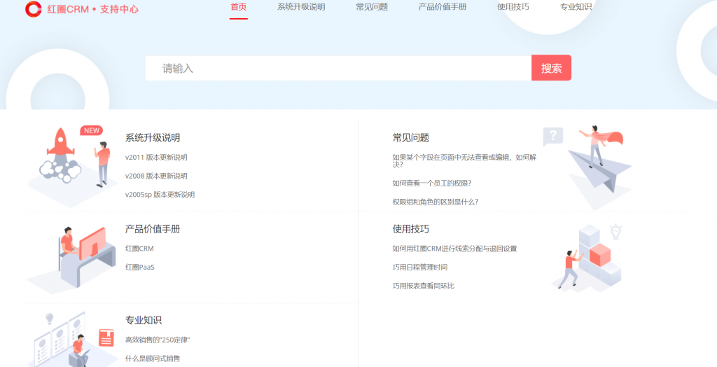 支持中心包含产品价值手册、版本更新说明、常见问题、常用技巧和专业知识五部分,用户可方便查找相关内容。在前台页面右上角点击“支持中心”可直接进入支持中心。
