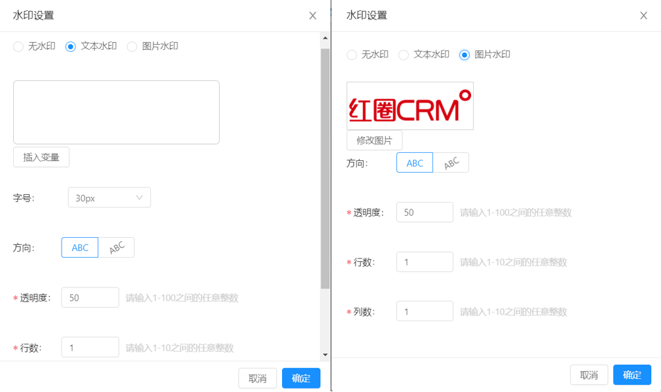 水印设置,支持文字和图片水印,其中文字水印可以取系统字段作为变量