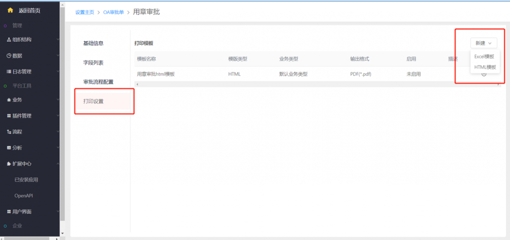 系统设置—扩展中心—已安装应用—OA审批单—打印设置,和对象一样支持excel和html模板