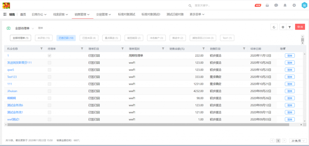 1) 理单页面显示及逻辑调整,单独显示待理单数据和按理单阶段显示全部销售机会,理单后数据直接显示到指定的理单阶段;