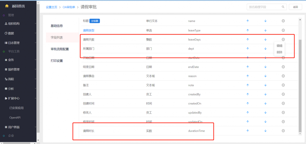 OA审批单—请假审批中默认增加实数类型的“请假时长”字段;原“请假天数”改为可删除