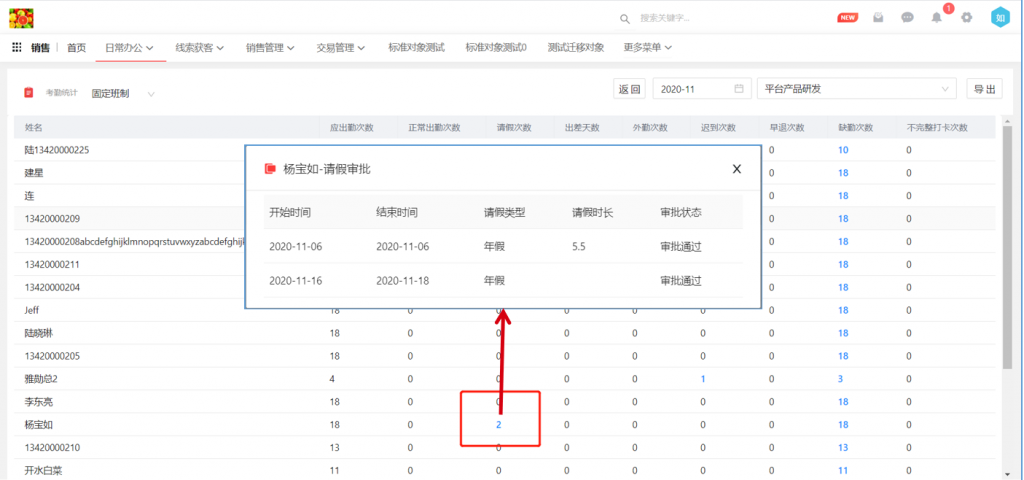 2)考勤统计中的请假天数列,改为请假次数,统计全部请假的申请次数,并支持点击穿透到 请假列表。