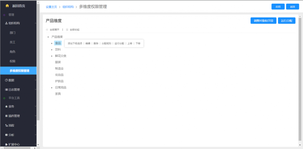 1)在后台组织架构-多维度权限管理,新建维度树;创建时需指定适用对象(需要扩展权限的对象)和规则字段(权限划分的条件依据)