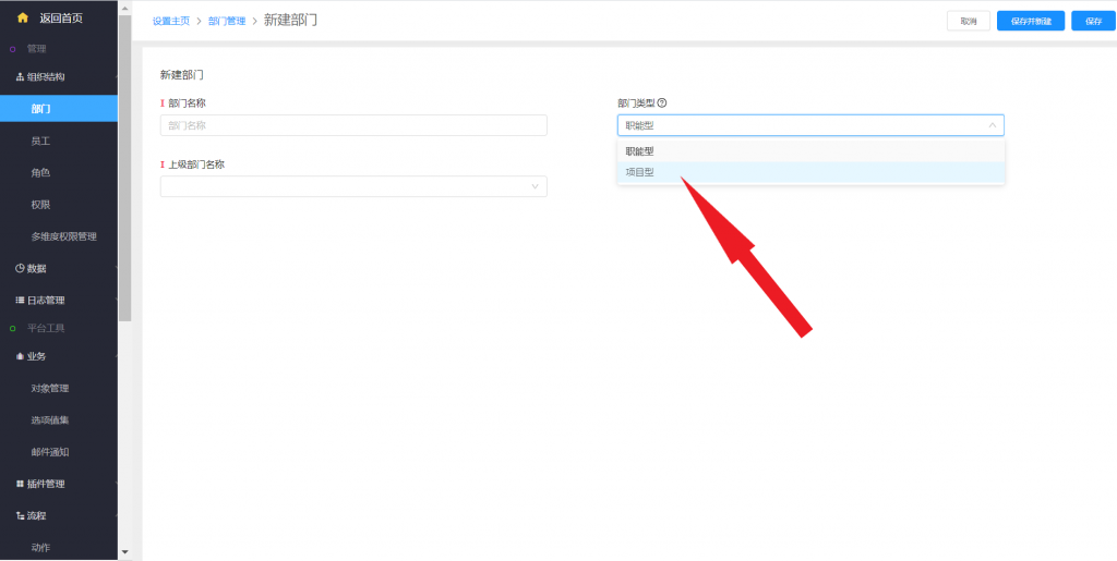 后台部门设置,增加部门类型,分为职能型和项目型