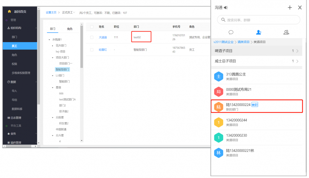 在后台的员工列表和前台通讯录中,会展示所选部门的兼职员工