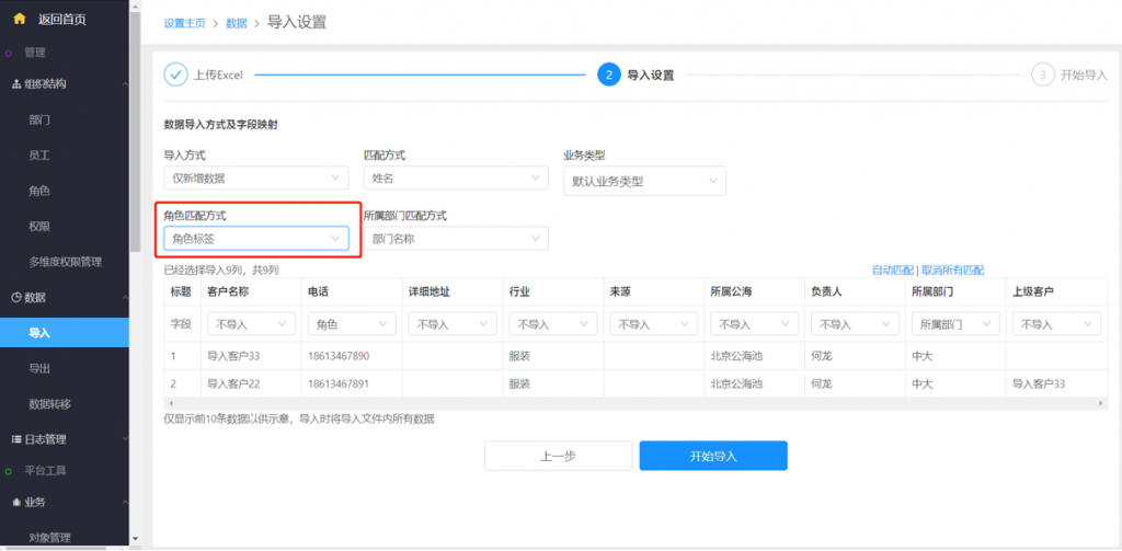 5)支持导入员工角色