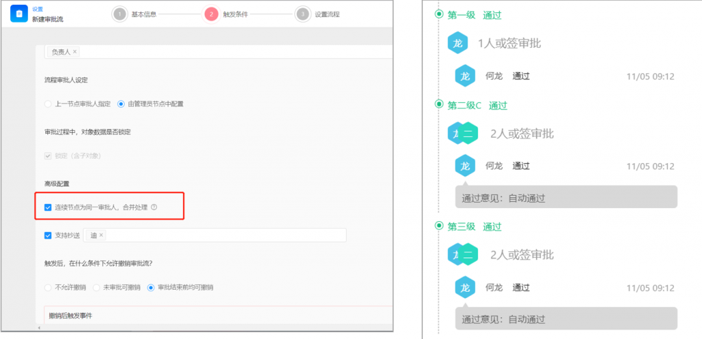 增加高级设置:连续节点为同一审批人,合并处理;第二级审批节点会自动通过