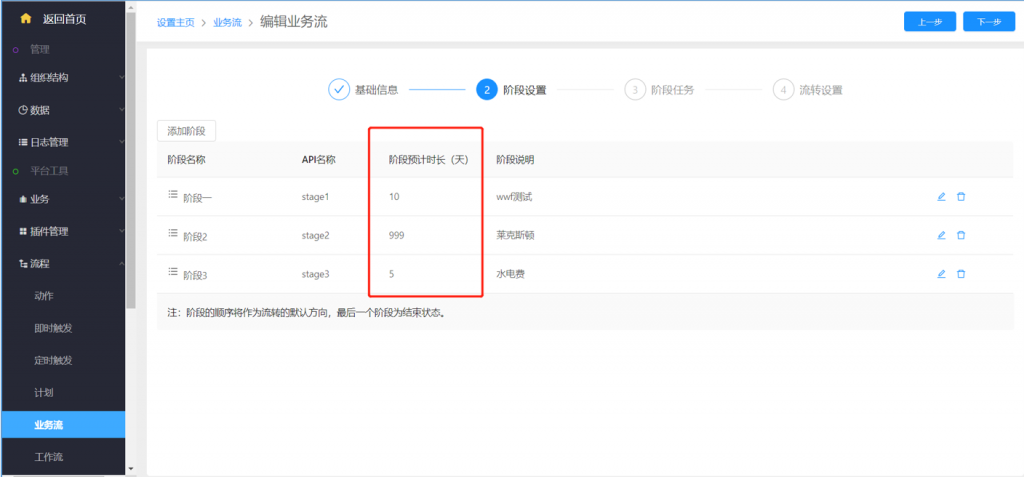 业务流条件阶段设置时,可以设置阶段预计时长,以天为单位