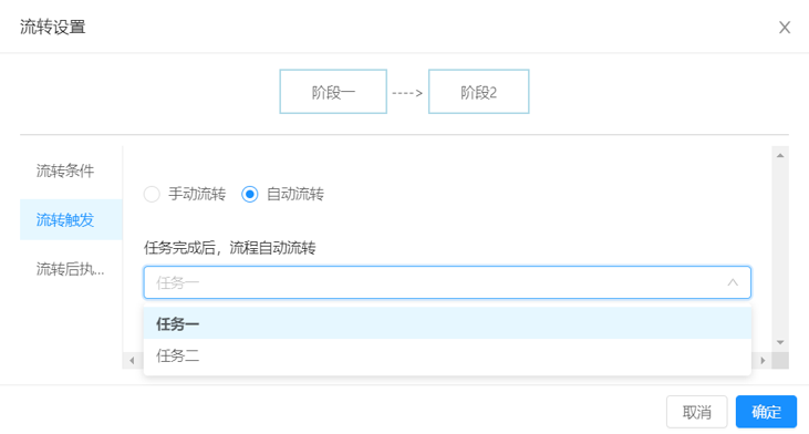 业务流流转设置中,流转触发中增加 自动流转,可以用当前阶段的某个任务作为触发动作;