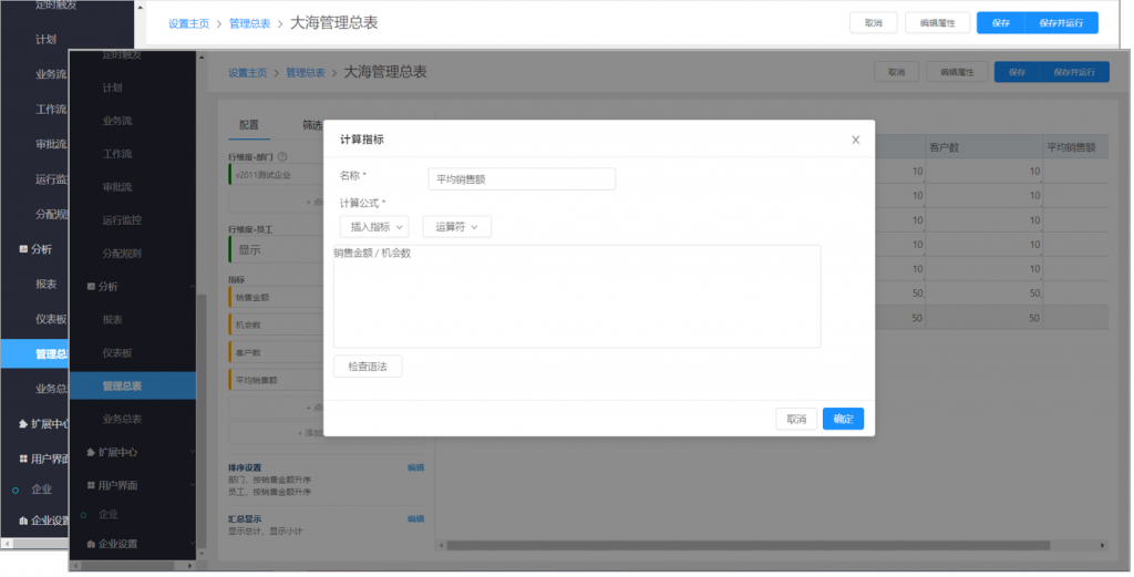管理总表可在配置时,增加计算指标列,对已有指标进行基本四则运算,提升总表的分析拓展能力