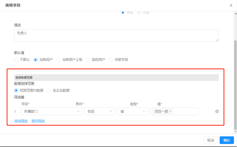 负责人或自定义的员工字段,支持设置筛选条件,在录入资料选人时,可缩小选取范围