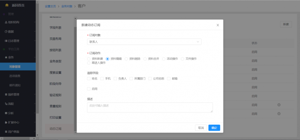 系统设置——业务——对象管理——动态订阅——新建