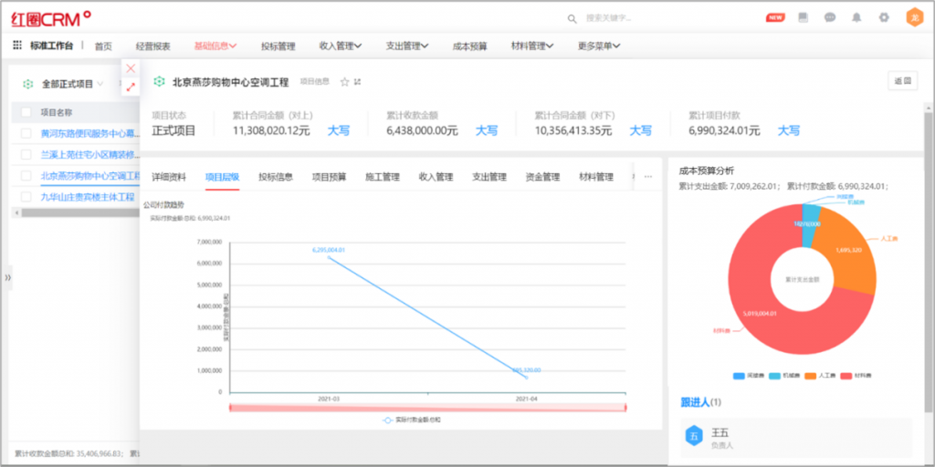 - 以客户为中心:客户的360度视图,在某一个重点客户的详情页面上,可以通过图表或报表的方式,快速知晓该客户的历史订单成交频率,服务请求的每月次数,今年的回款情况分析、拜访跟进情况等