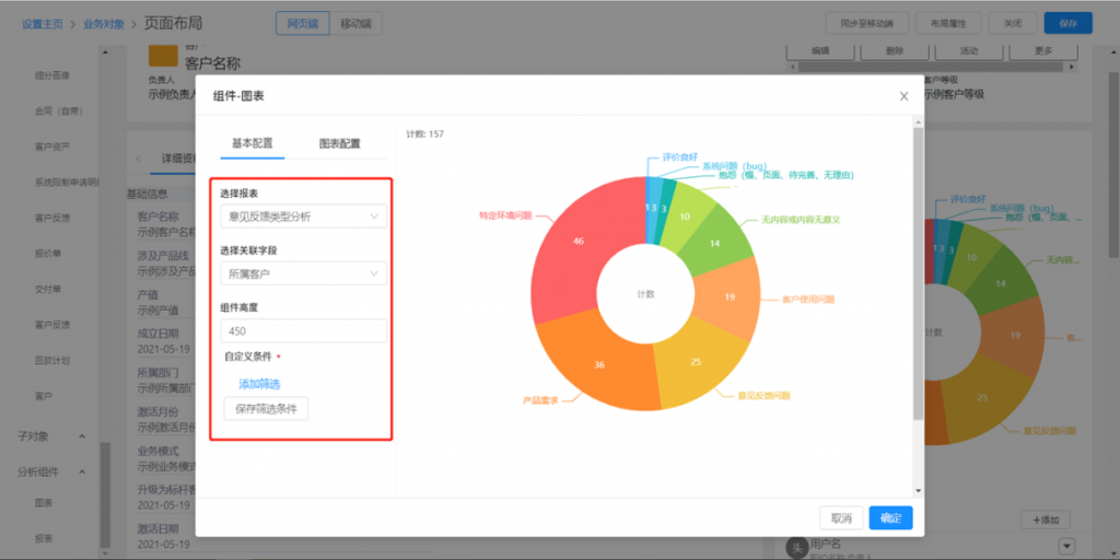 - 分析组件:选择图表和报表,拖入右侧页面区域进行配置