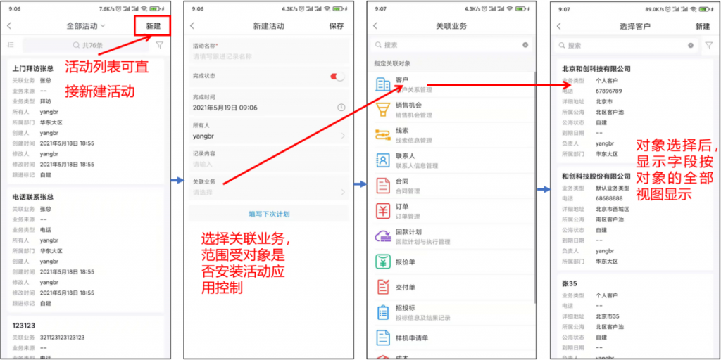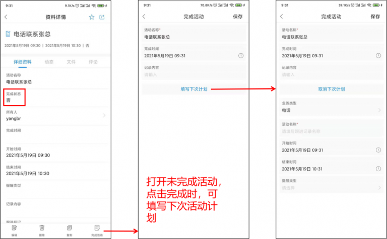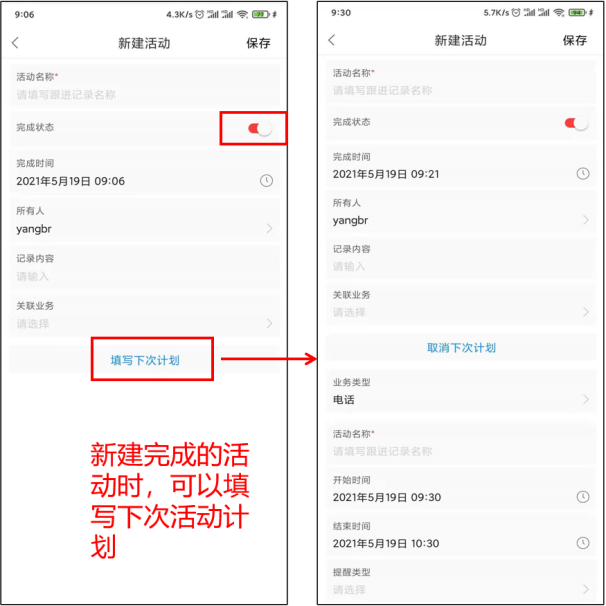 APP端活动列表可以在列表页直接新建,完成活动时可快速填写“下次计划”