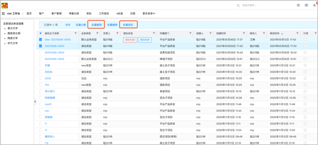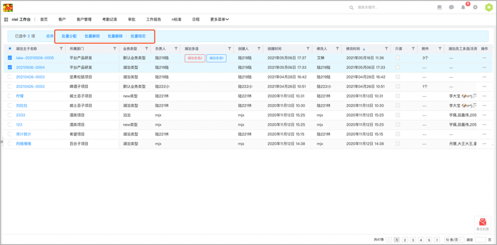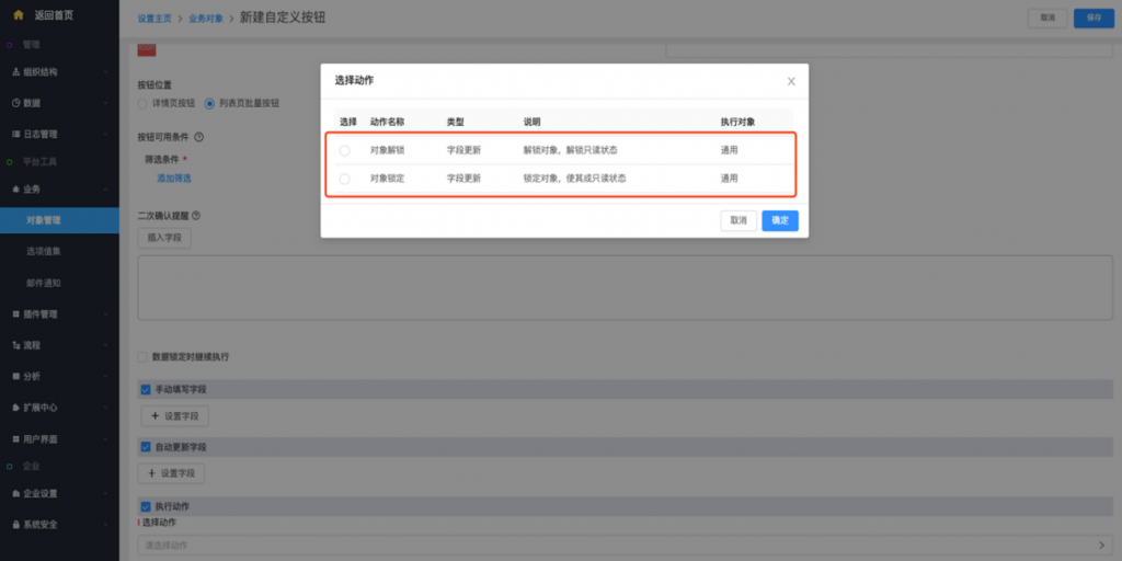 - 列表页批量按钮支持执行锁定和解锁动作:列表页批量按钮支持执行动作,可以执行锁定和解锁动作,在前端实现批量锁定和批量解锁