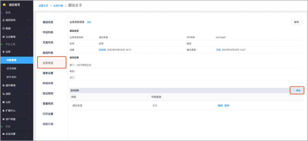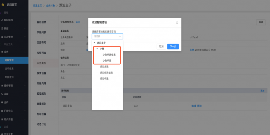 - 主对象业务类型控制子对象:主对象的业务类型可以控制子对象的单选及多选字段