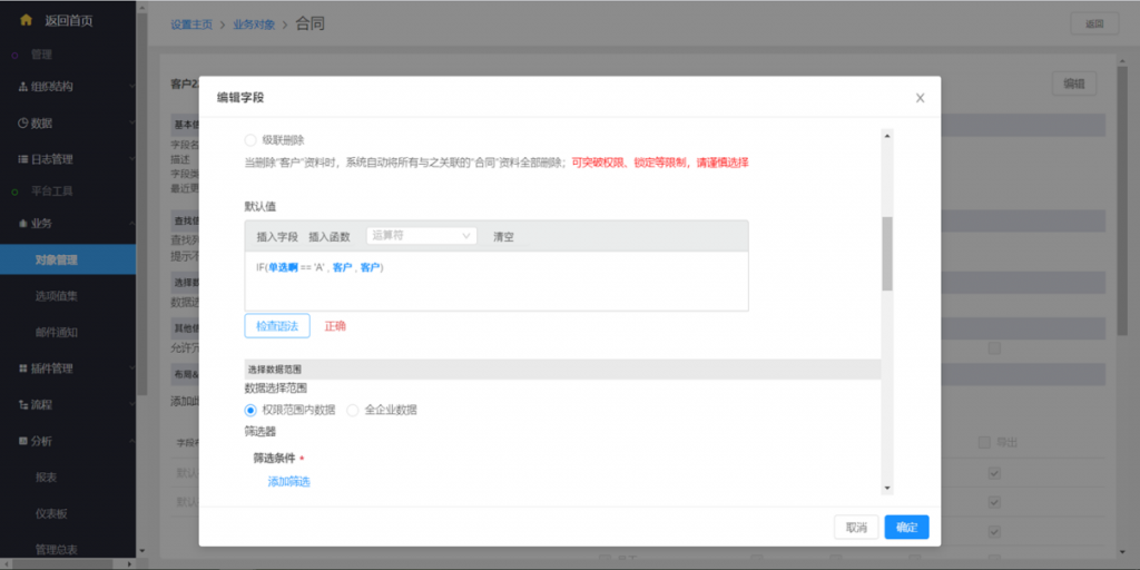 可以选择下游对象和相关操作,其中资料编辑需勾选具体字段,可选范围是下游对象字段追踪里的字段