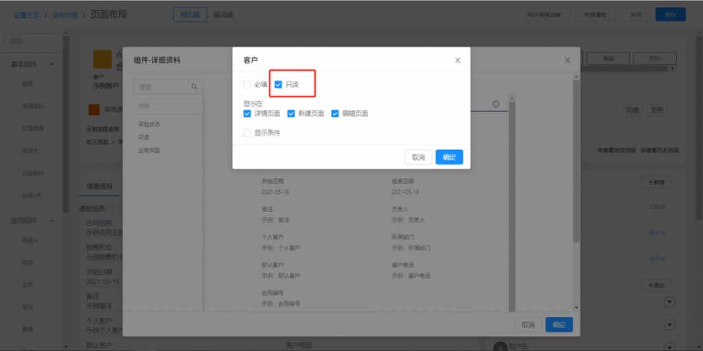 - 页面布局字段可配置只读:页面布局-详细资料组件中,字段可配置只读属性,在新建或编辑时,字段不可手动填写,但默认值可正常计算