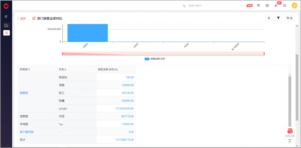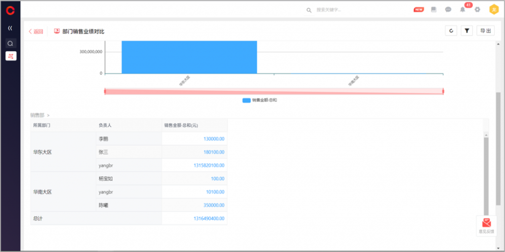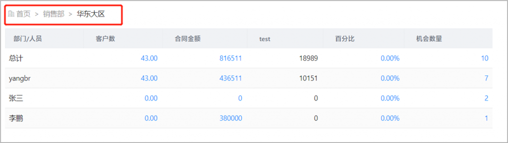 部门/人员钻取分析:简报组件可开启“支持部门/人员下钻分析”,开启后,在简报查看时,可点击进入分析报表,以数据负责人为依据,按照部门/人员的逐级钻取查看指标在各部门及员工的分布情况