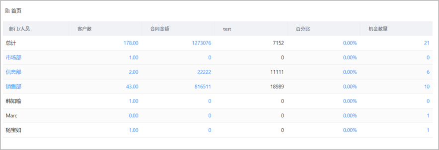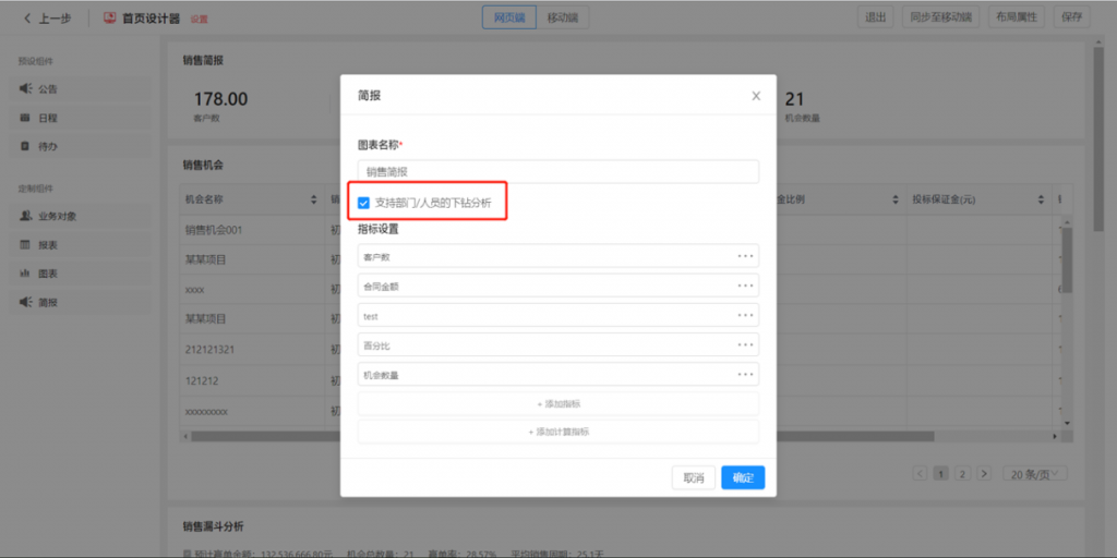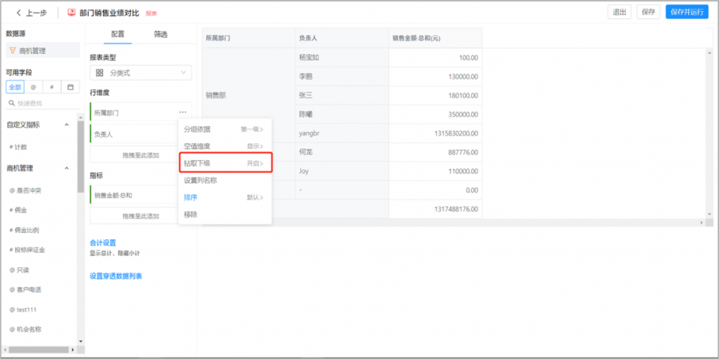 自定义报表支持部门下钻:当以部门为维度时,可开启部门下钻,逐级查看下级部门的分析数据
