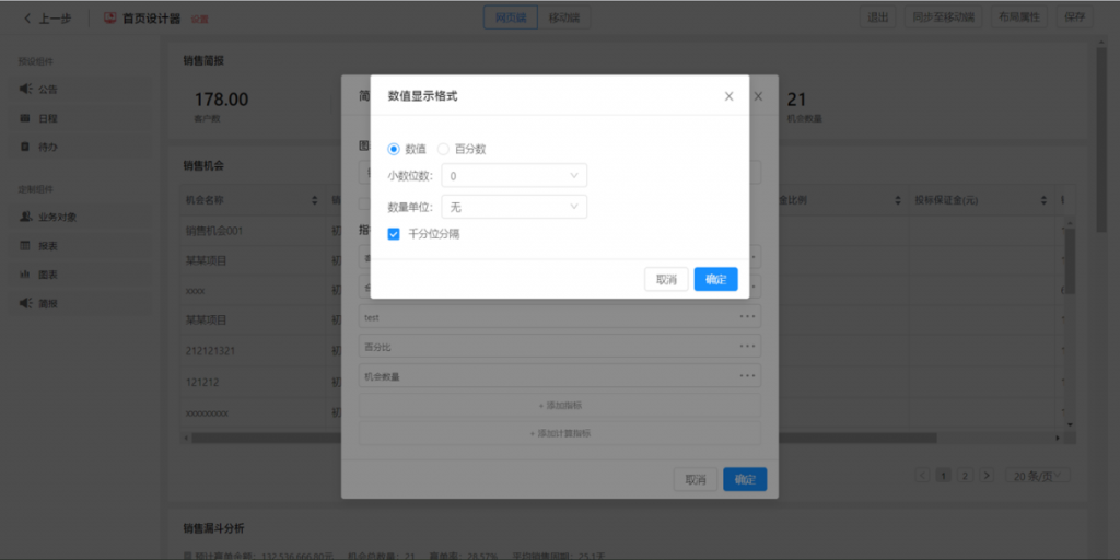 数值显示格式:指标都支持数值显示格式的设置,可设置单位、小数位数、百分比等