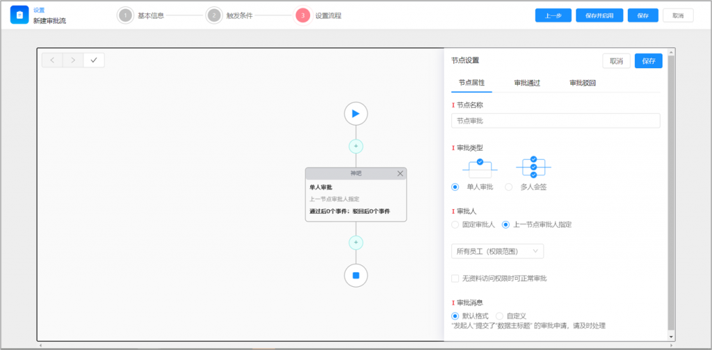 复制审批流时,支持将节点中的可复制信息带入到新流程中,如节点名称、类型、审批人、抄送人、意见和其他通用设置