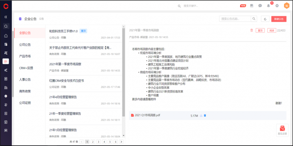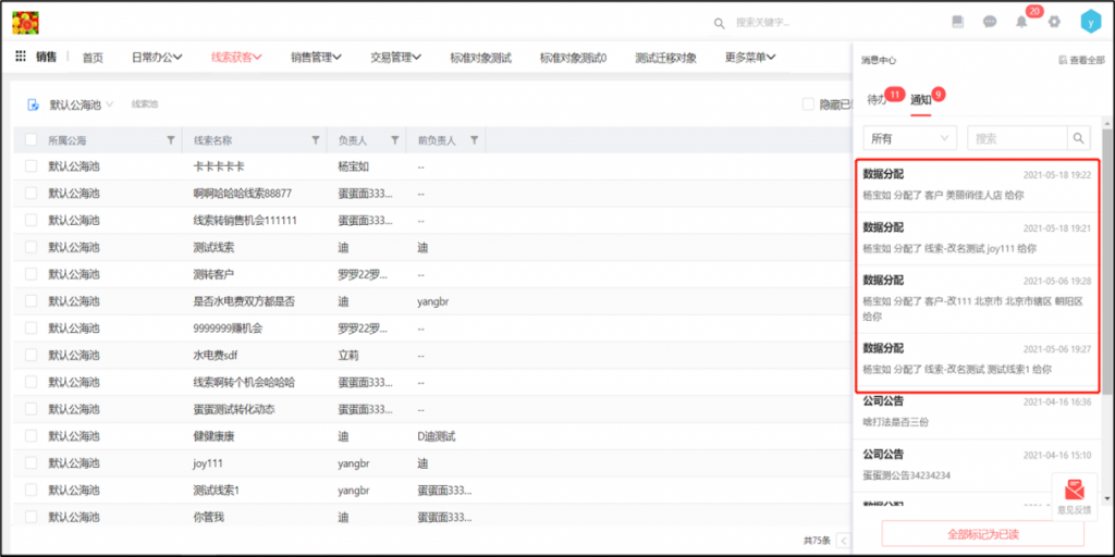 线索池、客户池管理员分配数据后,系统会给新负责人发通知提醒