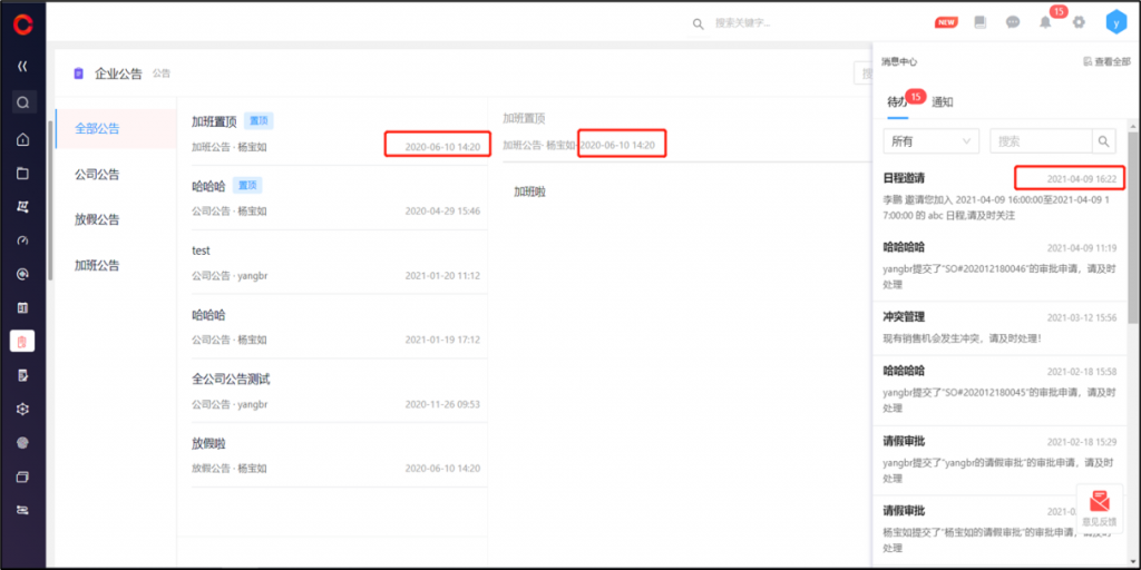 通知、待办、公告、动态、审批流历史中的时间显示完整时间,如2021-05-21 10:11,时间留痕更严谨。