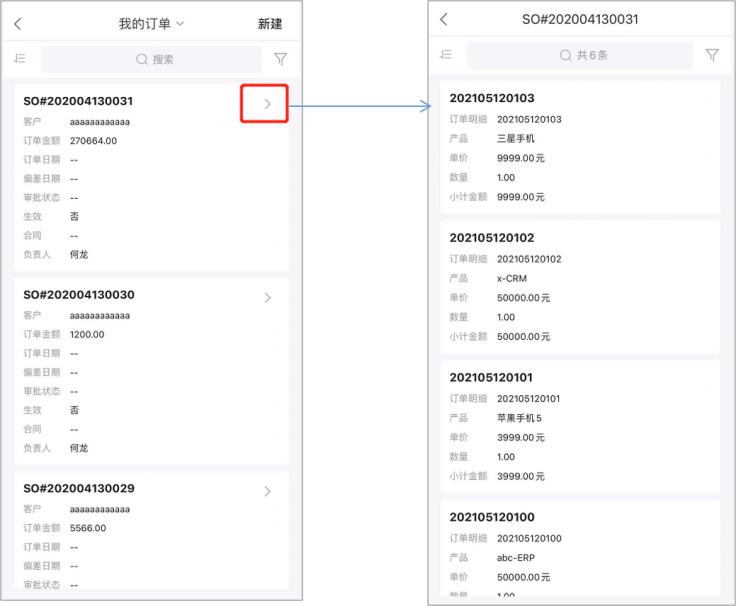 App端子对象列表显示双列:子对象组件中的字段会以两列的方式进行展示,方便快速查看明细