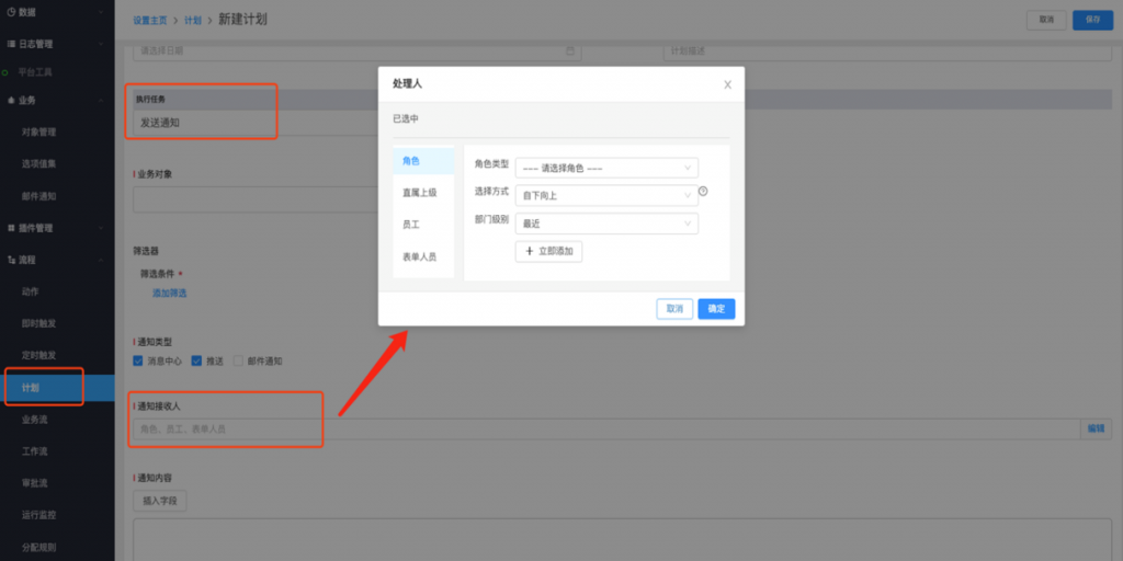 计划的通知接收人选人组件优化:计划的通知接收人选人组件支持按角色、直接上级、员工、表单人员的维度