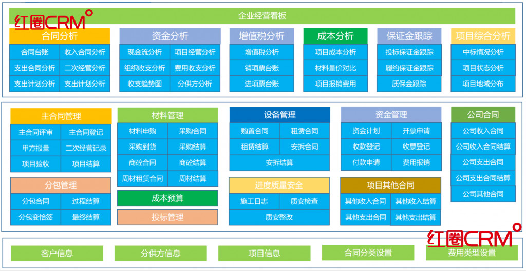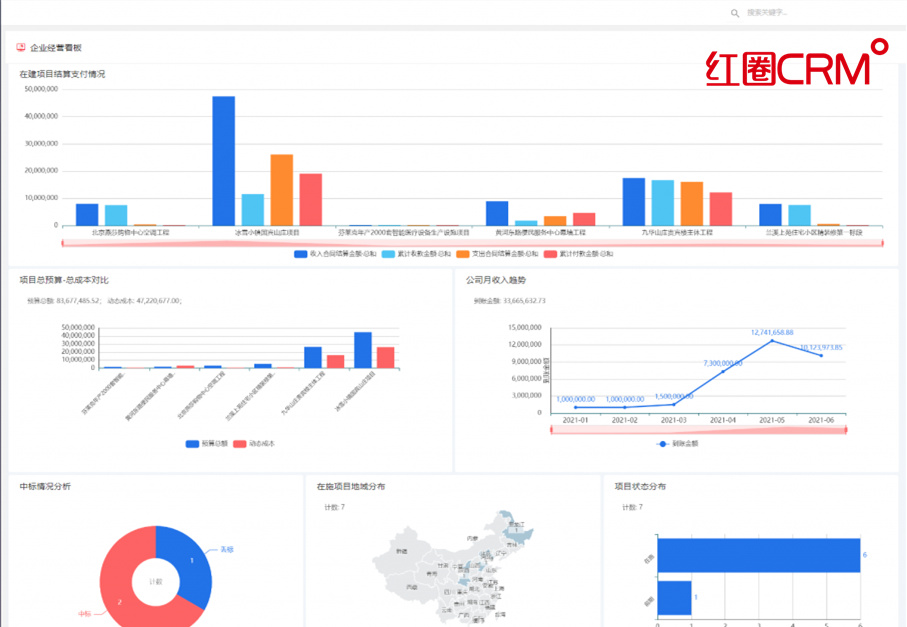 红圈CRM v2.0专门服务于建筑工程企业项目管理,功能更聚焦于建筑工程项目经营,六大工程业务闭环,为建筑工程企业的经营结果负责。
