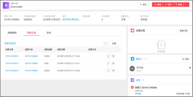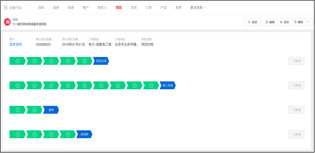 红圈CRM+能够帮助企业建立清晰的项目回款计划,在对施工进度进行管理的同时,同步推进回款管理,企业可以清楚地掌握各个项目的回款情况,系统还能对逾期回款计划进行提醒(提醒规则可以按企业实际需求设定),帮助企业加速资金回笼。
