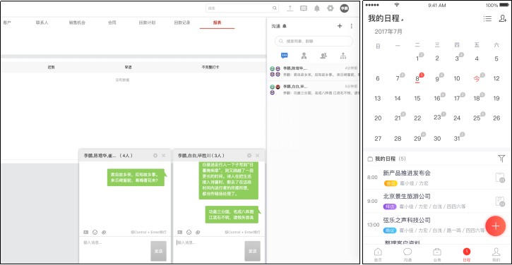 红圈CRM+能够帮助企业员工围绕业务紧密协同,例如项目进展信息在项目成员中共享,再如通过移动的考勤、日程、审批、公告等,提高跨团队协同工作的效率,快速推动销售、施工等各项工作。